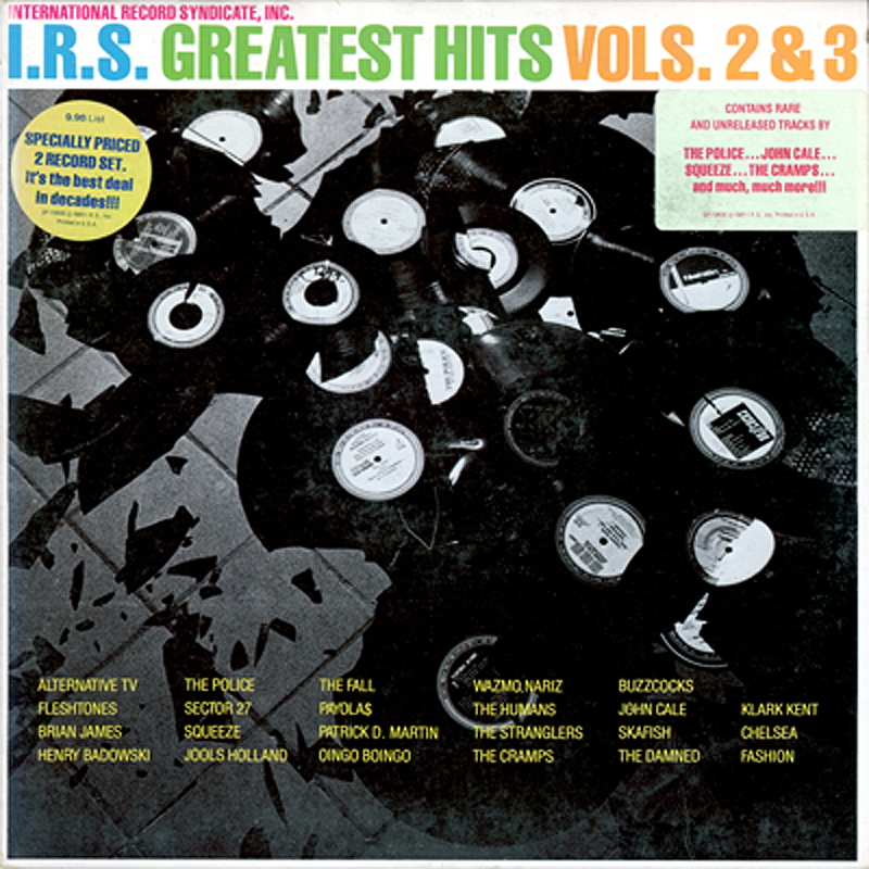 “I.R.S. Greatest Hits, Vols. 2 and 3, I.R.S. Records, 1981. Featuring The Police, Buzzcocks, The Damned, The Fall, The Cramps, The Stranglers. Cover art direction, design and illustration by Carlos Grasso. Photos by Scott Lindgren.