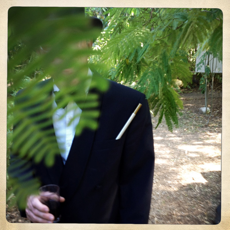 David Lovering of The Pixies takes a vino break during a Dumfuxx photo shoot. Being the renowned magician that he is, he can’t help but try and disappear into the foliage. Now you see him, now you…see him. Note the jauntily cocked magician’s wand in his pocket. Los Angeles CA, 2012. Photo by Edward Colver.