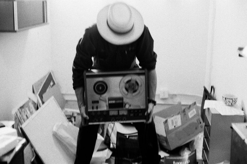 Carlos Grasso of Dumfuxx hoists his vintage TEAC reel-to-reel tape machine during an ill-advised exercise session. Los Angeles CA, 2011. Photo by Eric Gorfain of The Section Quartet with his vintage Leica film camera.