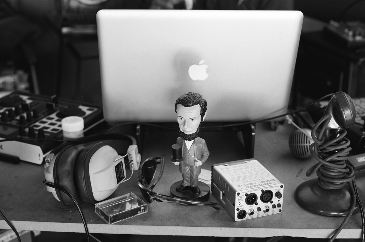 The equipment table of Carlos Grasso with electronic gear and a Lincoln bobblehead statuette during a Dumfuxx rehearsal at The Brewery Arts Colony, Los Angeles CA, 2012.